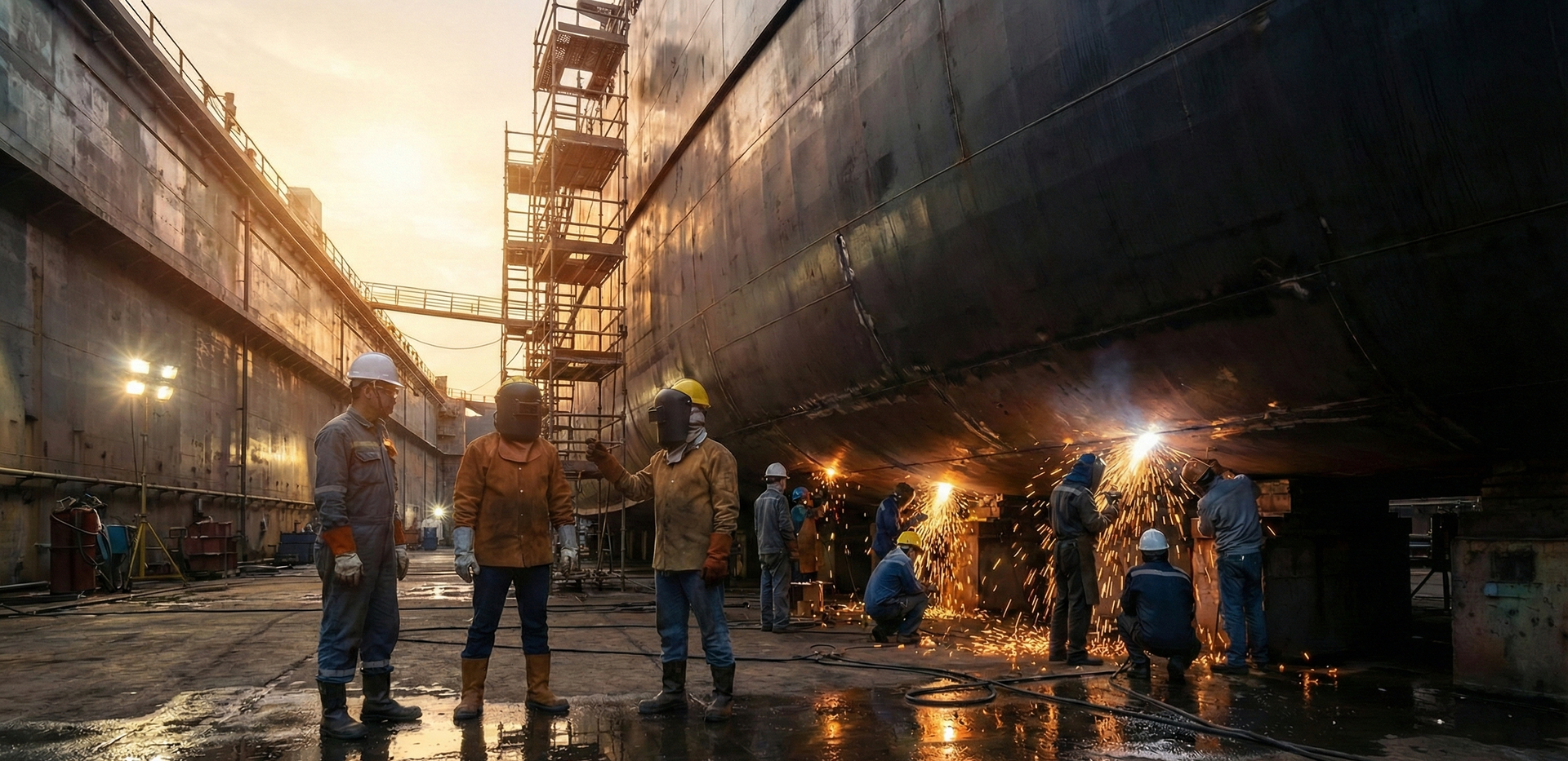 O Desafio: Nos estaleiros navais, o custo de um navio parado em doca seca é crítico. A reparação e construção de blocos exigem velocidade sem comprometer a estanquidade e a segurança.